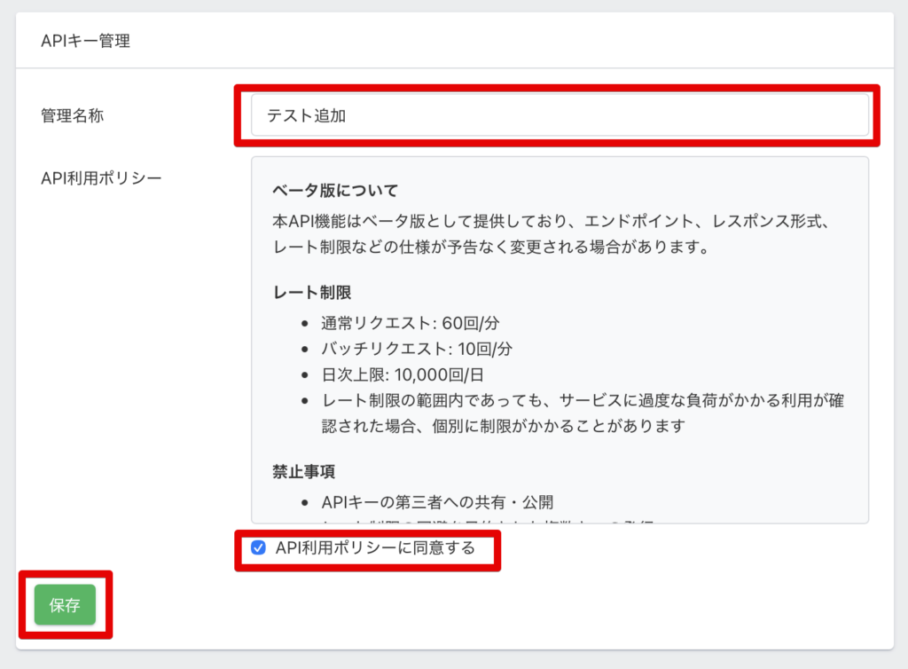 「API利用ポリシー」に目を通し、同意できる場合は「API利用ポリシーに同意する」にチェックを入れて「保存」をクリックします。