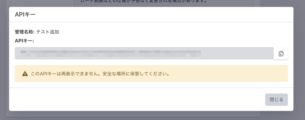 ※ APIキーが第三者に流出すると、不正利用などのリスクがあります。悪用されないよう、お客様ご自身で適切に管理してください。