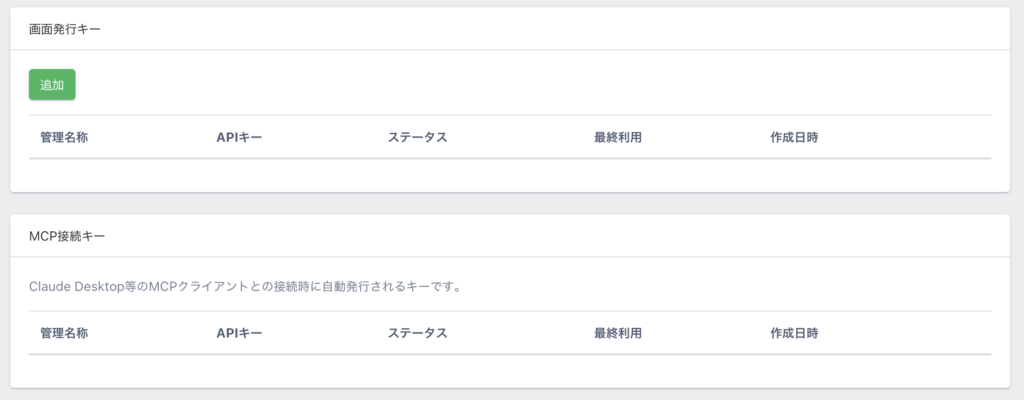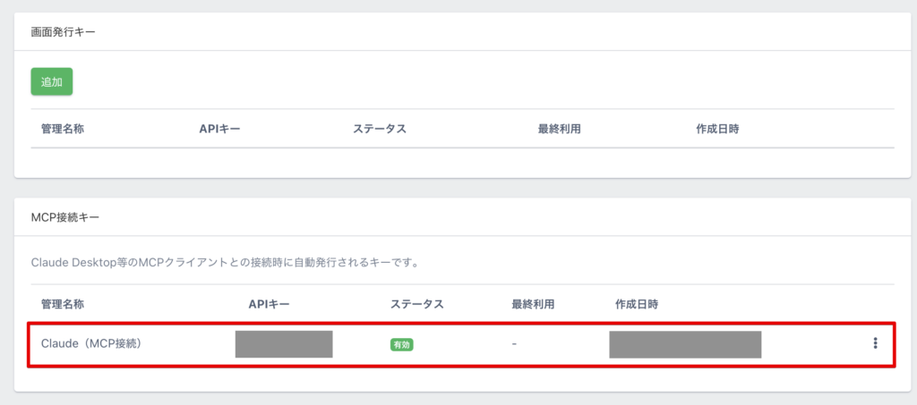 新しいMCP接続キーが追加されていれば、MCP接続キーの追加は正常に完了しています。