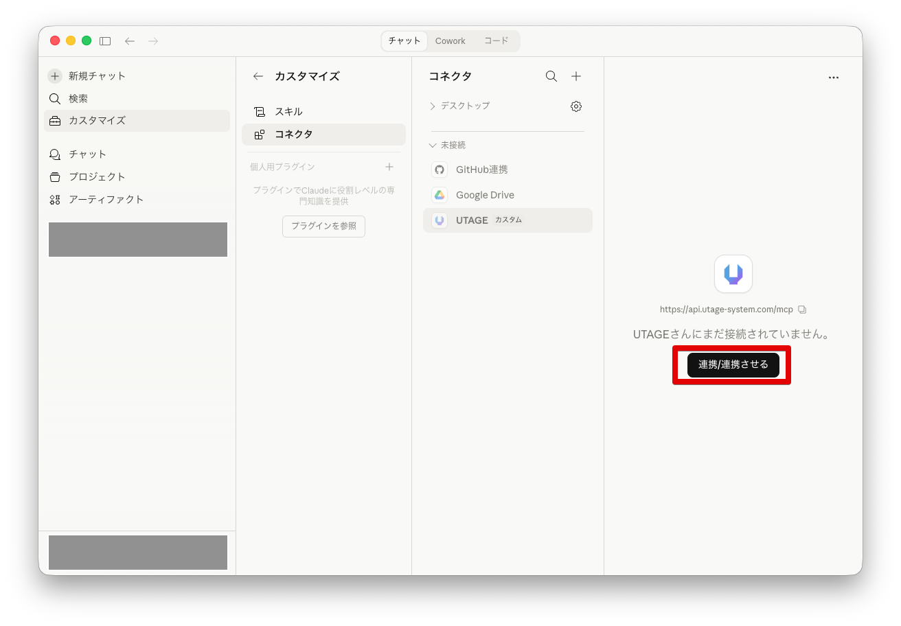 UTAGEのカスタムコネクターを追加し、「連携 / 連携させる」ボタンをクリックします。