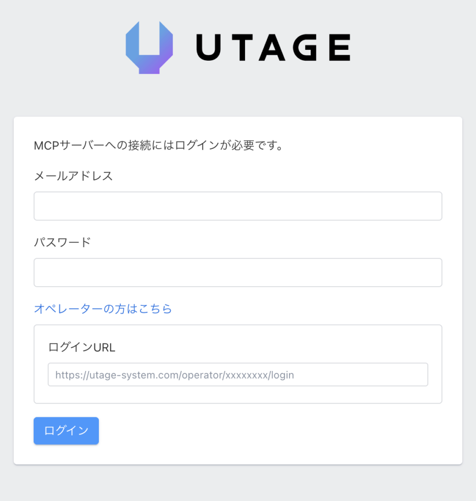 ブラウザでログインページが自動的に表示されますので、UTAGEのログイン情報を入力し、「ログイン」をクリックします。