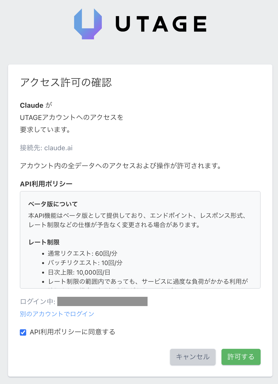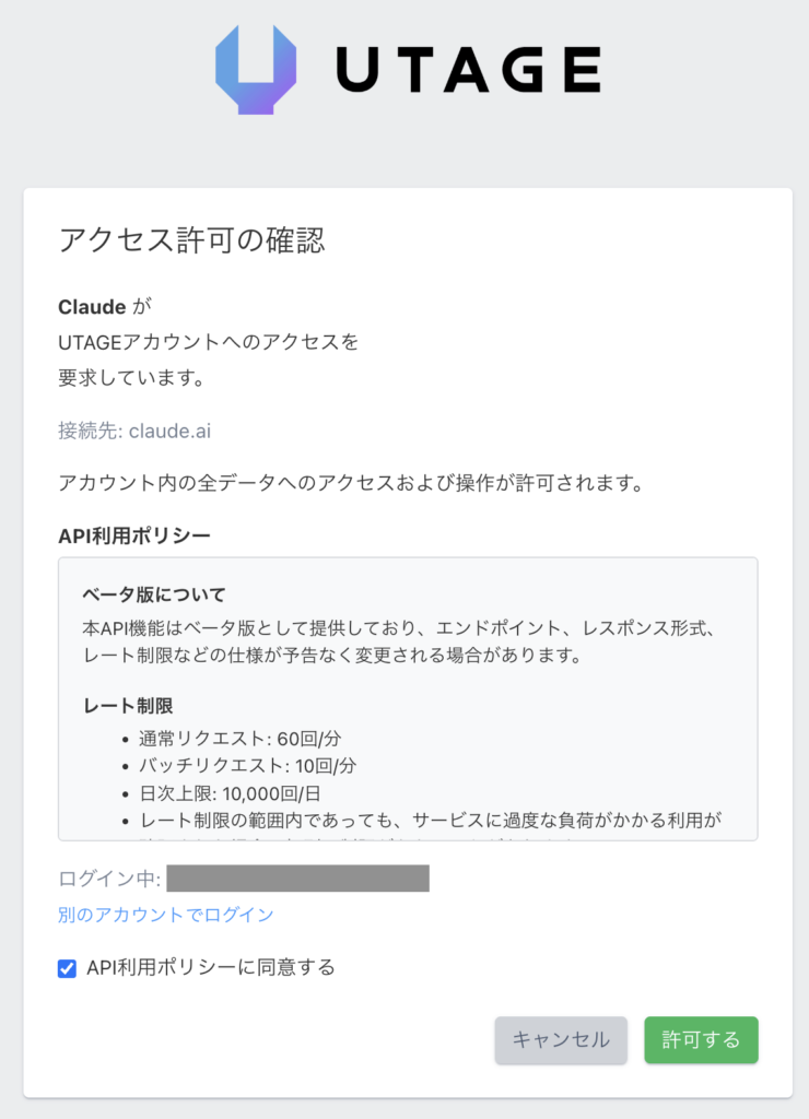 「アクセス許可」画面が表示されますので、「API利用ポリシー」に目を通し、