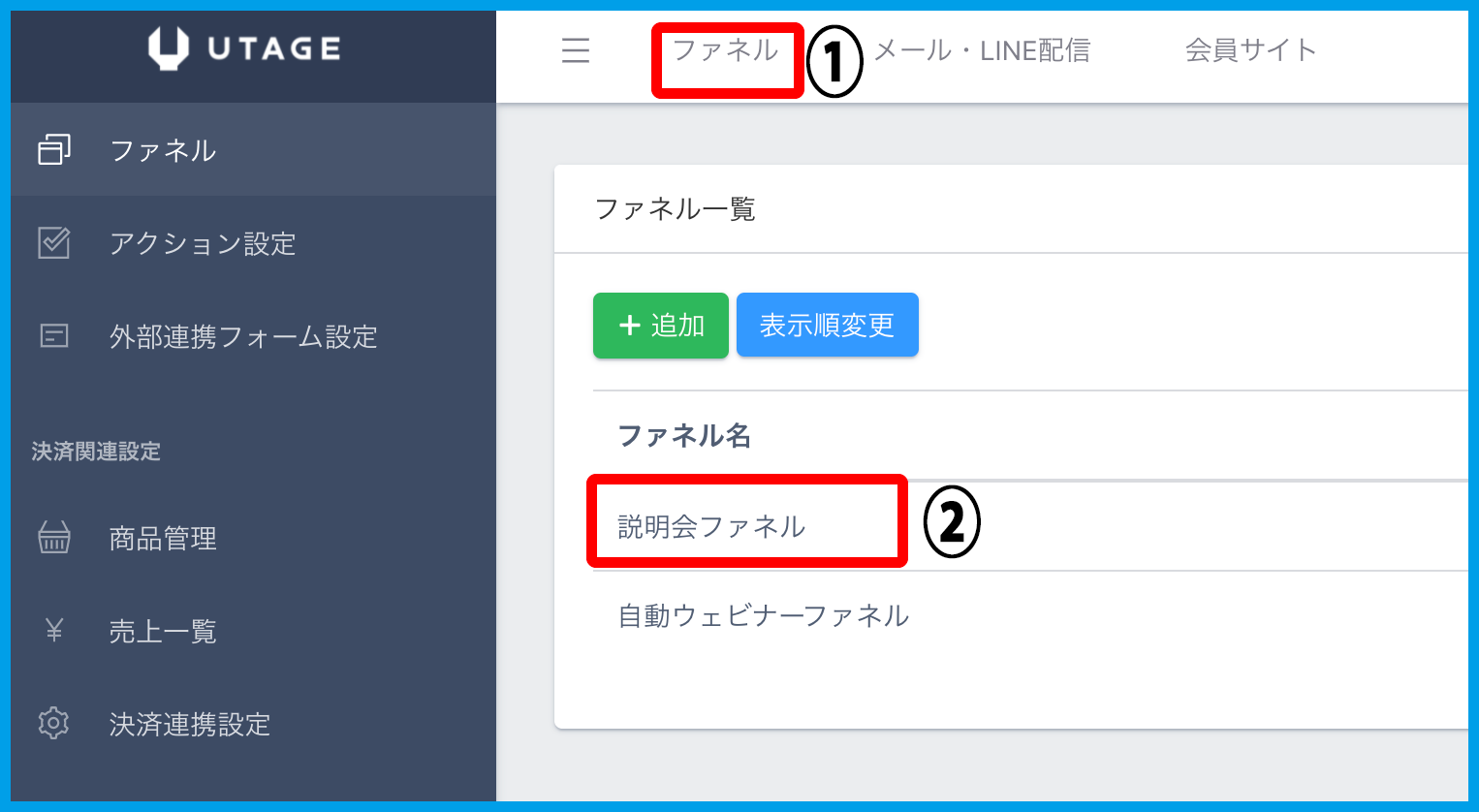 1.上メニュー【ファネル】を選択し、「ファネル一覧」から編集したいファネルをクリックします。