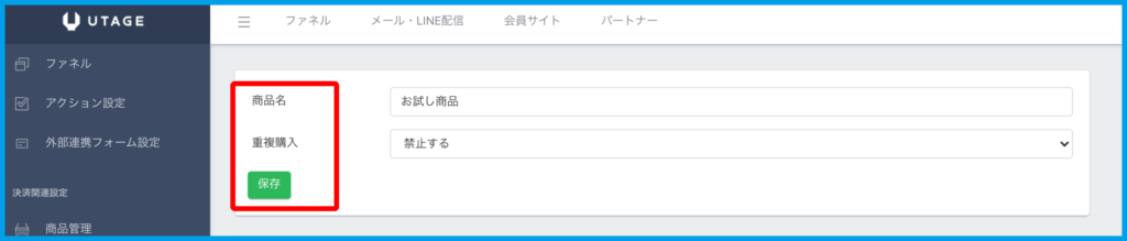 3.「商品名」「重複購入」を入力、設定して【保存】をクリックします。