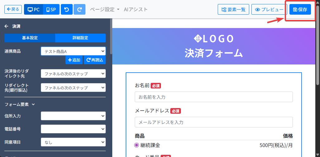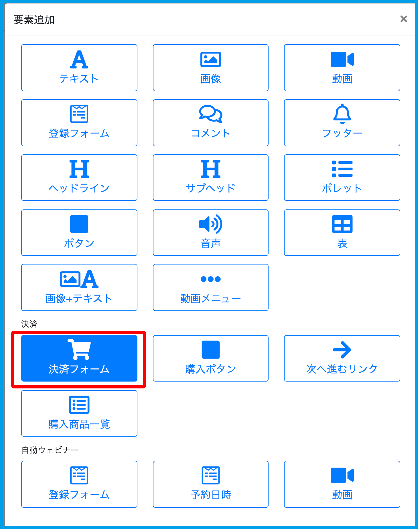 10.ポップアップ表示内にて【決済フォーム】をクリックします。