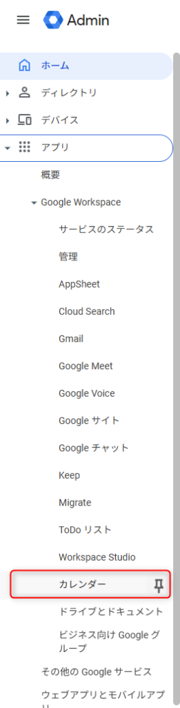 ②左側メニューから 「アプリ」 > 「Google Workspace」 > 「カレンダー」 の順にクリックします。