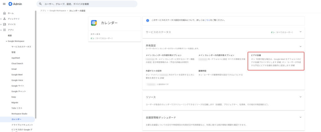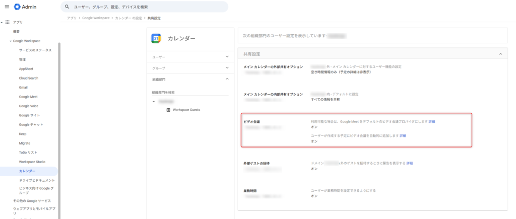 ③「共有設定」>「ビデオ会議」 をクリックします。