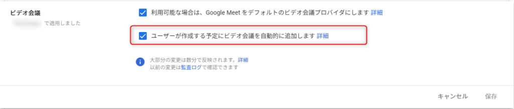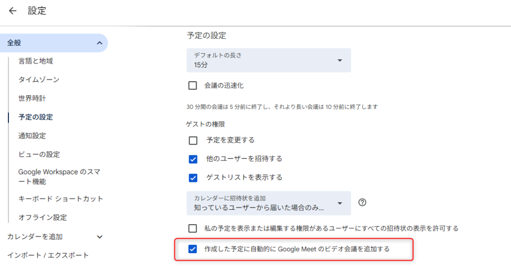 「作成した予定に自動的に Google Meet のビデオ会議を追加する」