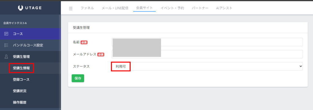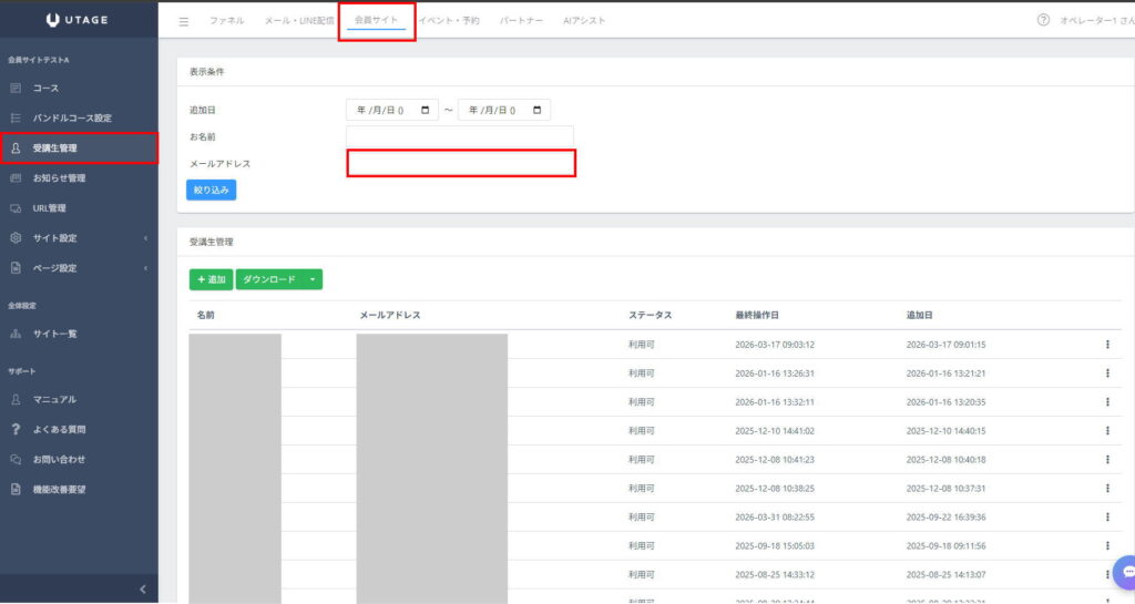 UTAGE > 会員サイト > サイト名を選択 > 受講生管理