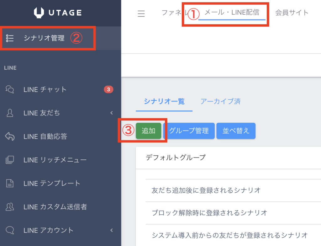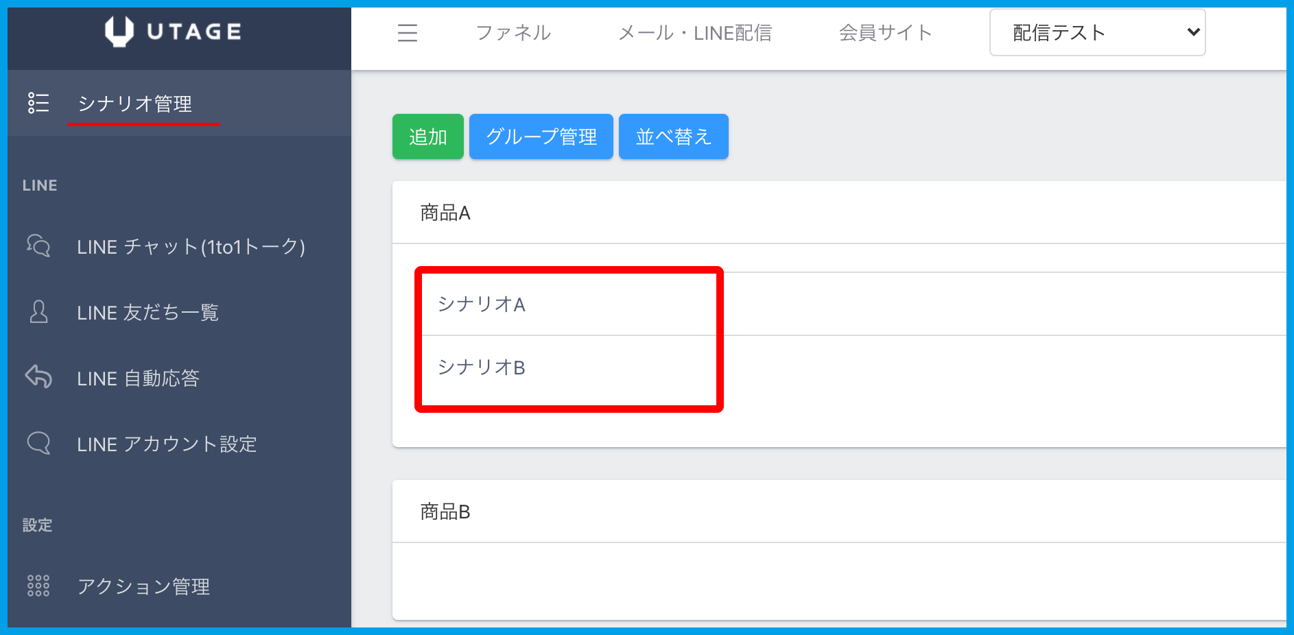 1.上メニュー【メール・LINE配信】>アカウント>【シナリオ管理】より、利用するシナリオをクリックします。