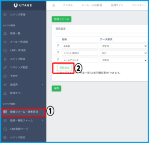 2.左メニュー【登録フォーム・読者項目】を開き項目追加をクリックします。