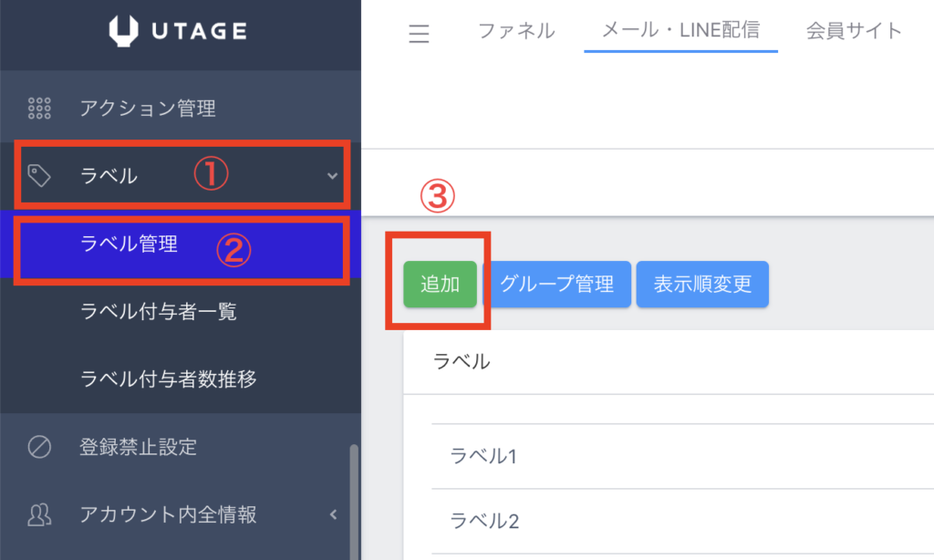 メール・LINE配信 > アカウント名選択 >左メニュー「ラベル」>ラベル管理