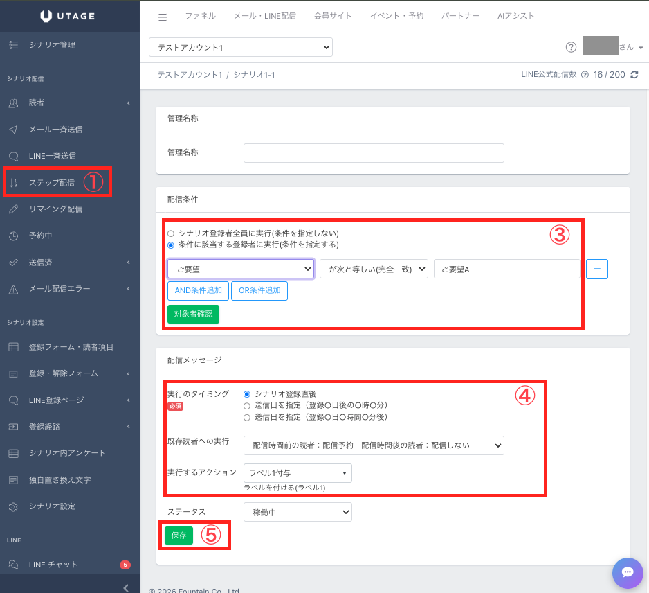 1.画面左メニュー【ステップ配信】にてアクション追加ボタンを押下し以下のように設定します。