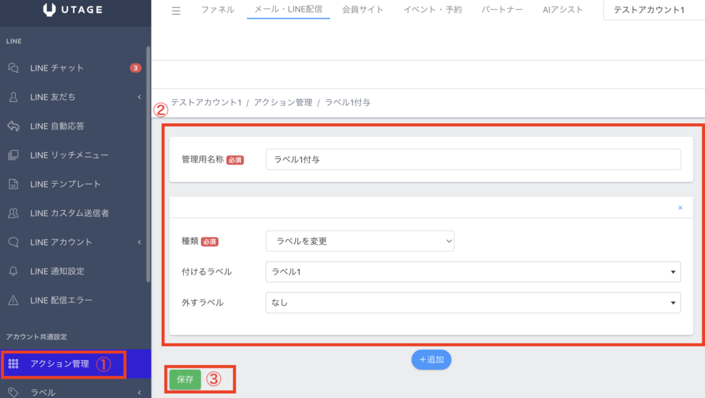 メール・LINE配信 > アカウント名選択 > アクション管理