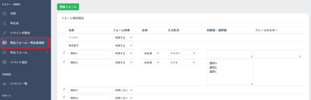「申込フォーム・申込者項目」から、フォームで使用する項目を設定できます。