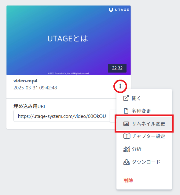 1.該当動画右下の【︙】マークをクリック > サムネイル変更 をクリックします。