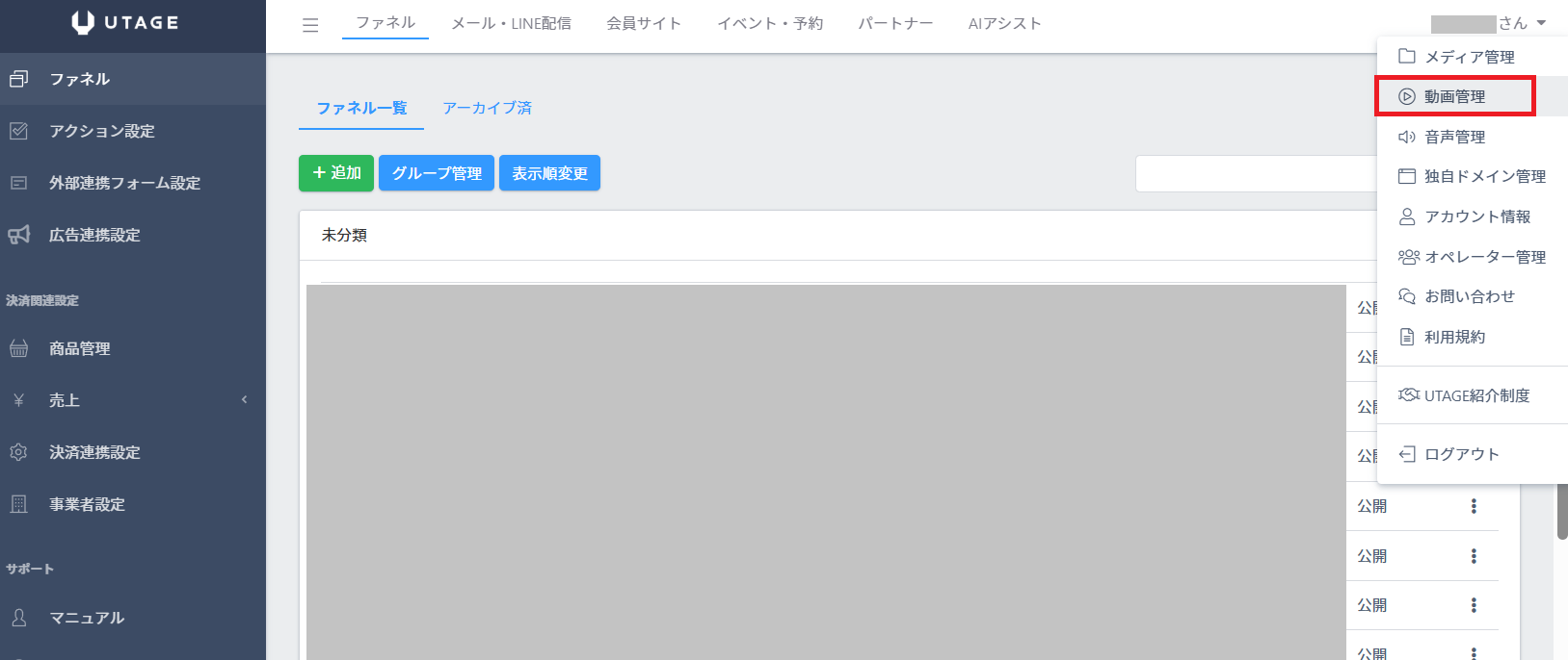 ※左メニューが「動画管理」であることを確認してください。