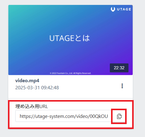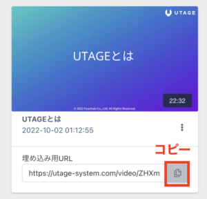 動画下「埋め込み用URL」をコピーして、埋め込みたい箇所へ設定してください。