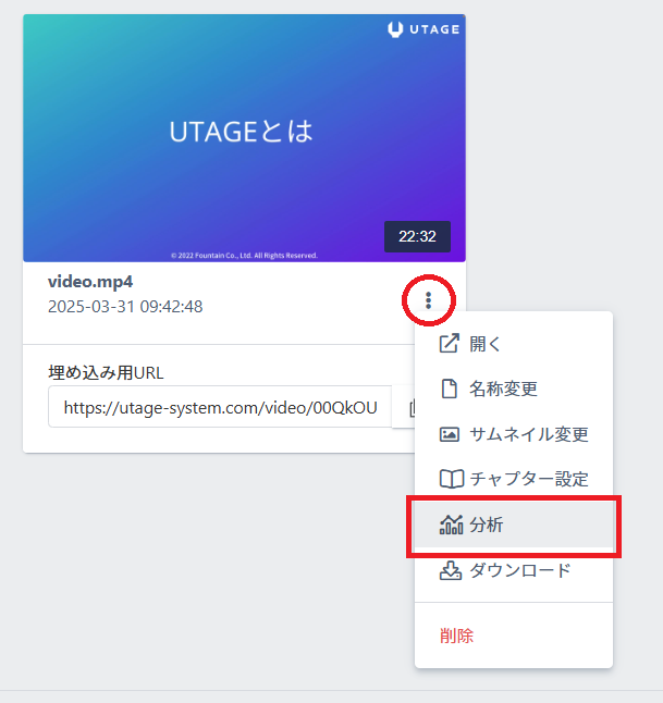 1.該当動画右下の【︙】マークをクリック > 分析 をクリックします。