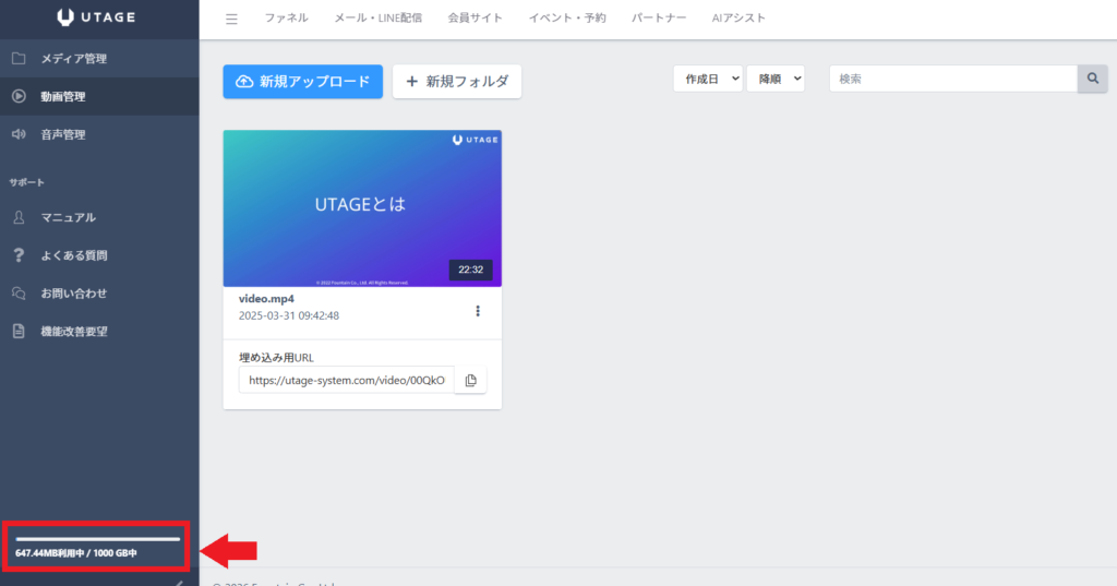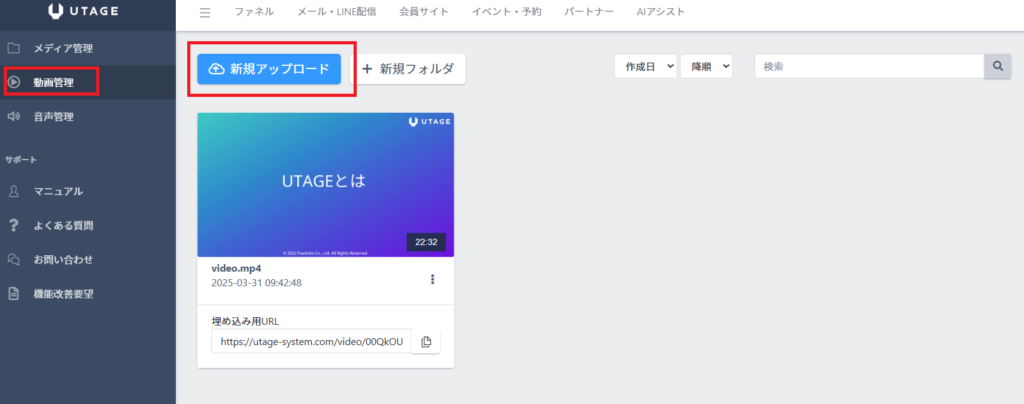 UTAGEシステム上に直接、動画をアップロードできる機能です。