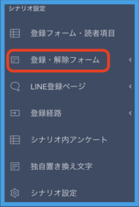 2.左メニュー【シナリオ設定】より【登録・解除フォーム】をクリックします。