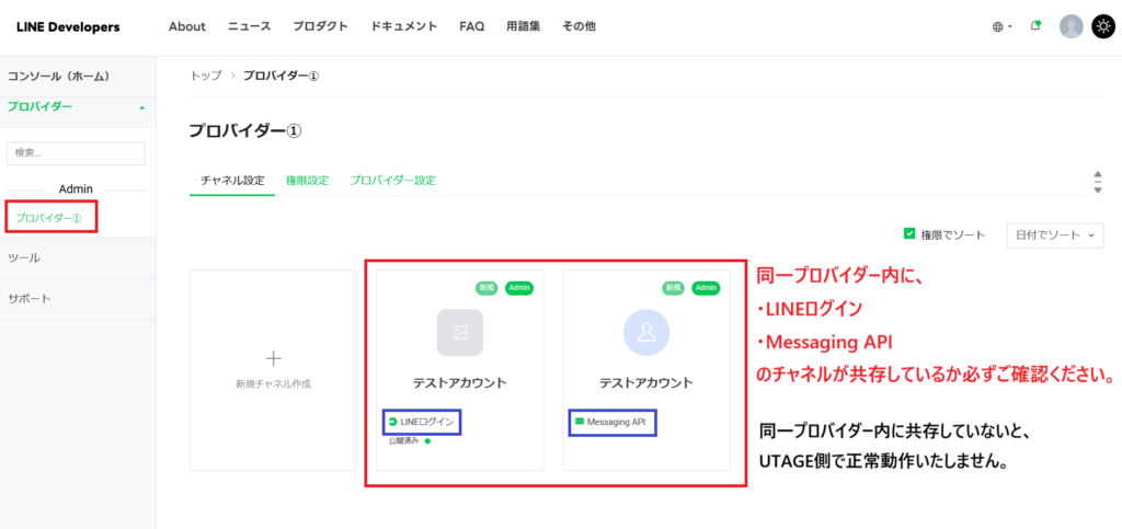 必ず【手順1−4.プロパイダー名を入力(LINE公式アカウント画面)】で入力した同じプロバイダー名でLINEログインチャネルを作成してください。