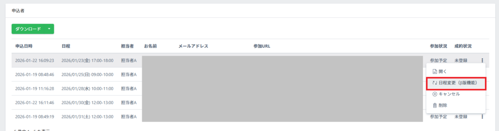 必ず該当申込者データの【︙】マークから日程変更画面へアクセスする必要があります。