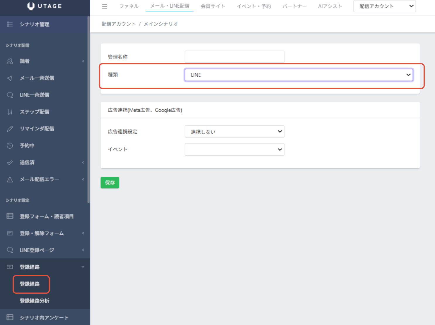 メール・LINE配信 >アカウント選択 >シナリオ選択 >登録経路